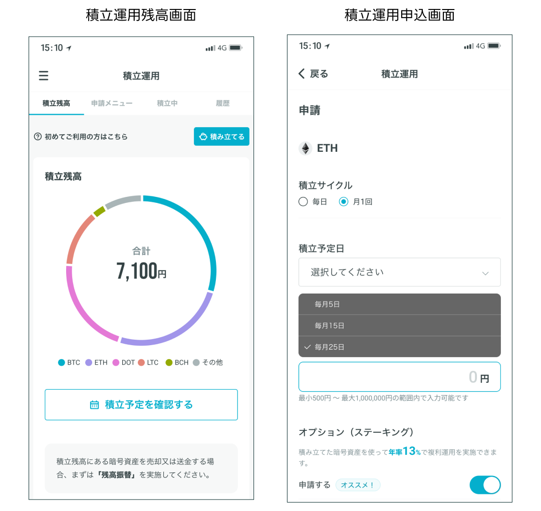 また当社の提供する積立サービスは積立運用残高として、通常の売買、入出庫の残高とは別に設定しているため、暗号資産運用額がしっかりとお客様が確認できる仕様となっております。