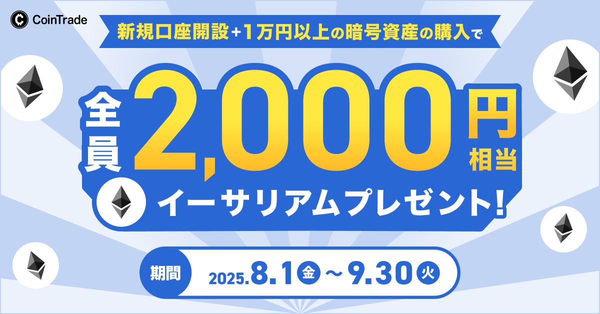 この度、CoinTradeでは、期間中に新で口座開設を完了し、1万円以上の暗号資産を購入された方全員に、2,000円相当のイーサリアムをプレゼントするキャンペーンを実施します!
