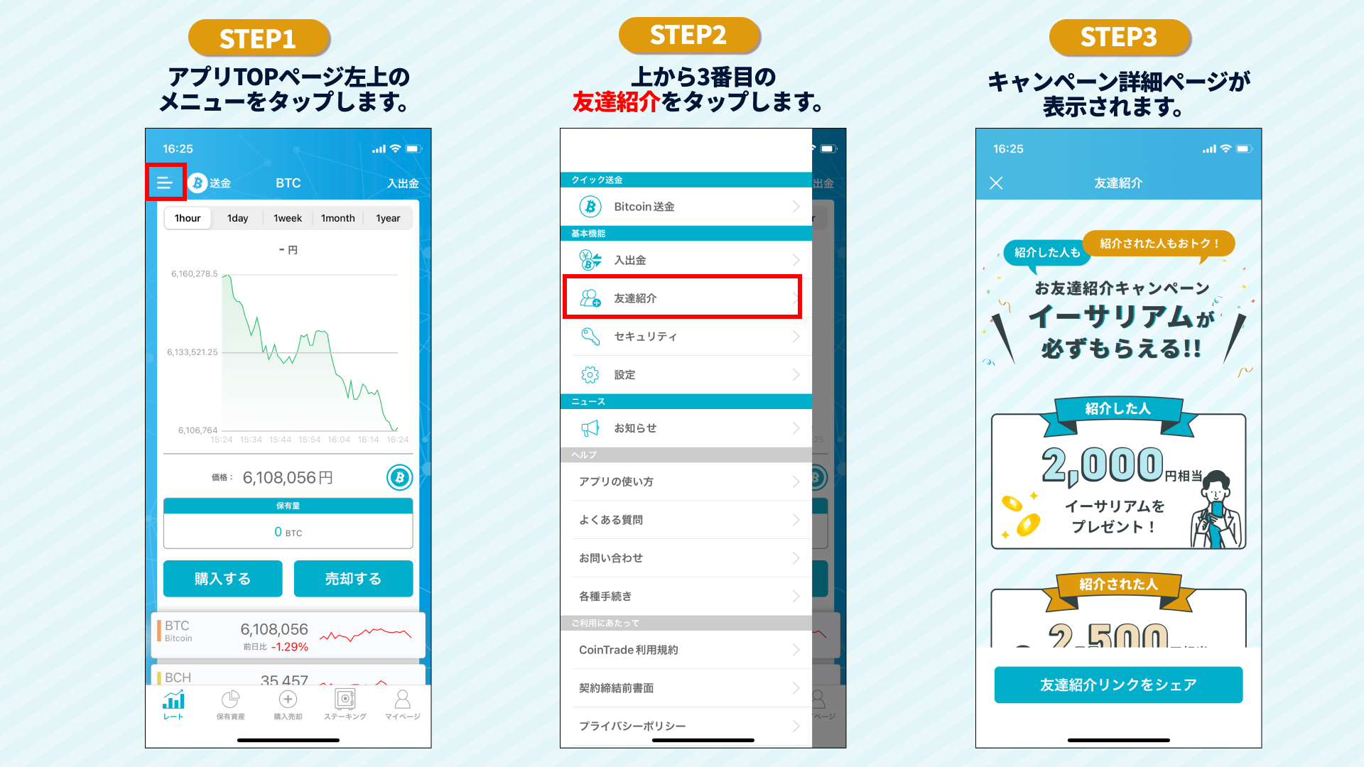 友達紹介キャンペーンの詳細につきましてはコイントレードアプリにログイン後アプリ内よりご確認頂けます。