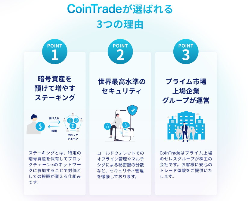 コイントレードと他の暗号資産業者で異なる大きな特徴は「ステーキングサービス」です。