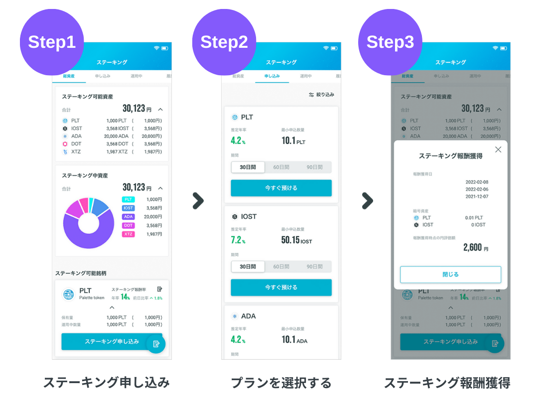 ステーキングのお申込みは3ステップで完了です。