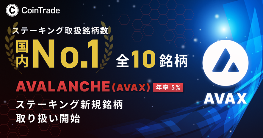 株式会社マーキュリー(本社:東京都世田谷区、代表取締役社長:都木 聡、以下、「当社」)は、当社の提供する暗号資産販売所「CoinTrade(コイントレード)」で、2023年11月29日より「CoinTradeStake(コイントレードステーク)」において新たに新規暗号資産アバランチ(AVAX)によるステーキングサービスを開始いたします。これにより「CoinTradeStake(コイントレードステーク)」では10種類の暗号資産のステーキングサービスを提供することとなり、国内業界取扱い通貨最多のステーキングサービスとなります。