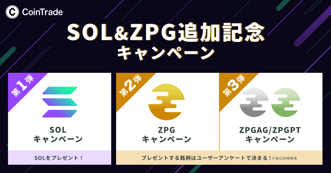 また、「CoinTrade(コイントレード)」はソラナ(SOL)、ジパングコイン(ZPG)、ジパン グコインシルバー(ZPGAG)、ジパングコインプラチナ(ZPGPT)の 4 銘柄の取り扱い開始を 記念して、第 1 弾から第 3 弾までの 3 つのキャンペーンを開催いたします。