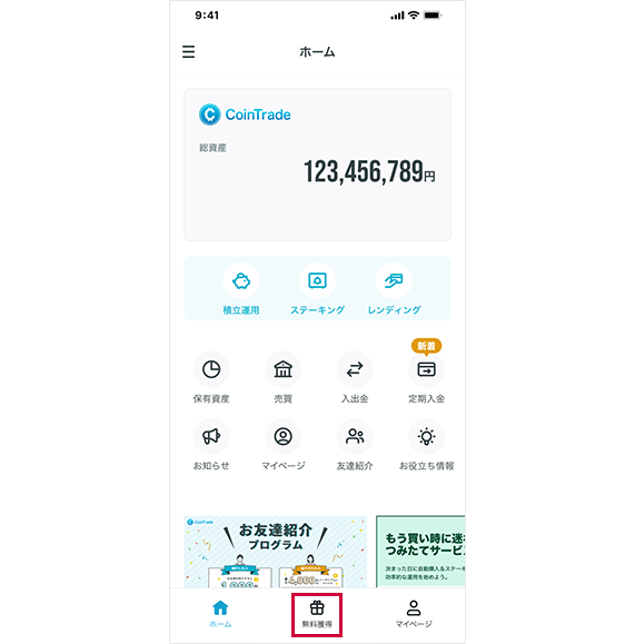 「CoinTrade(コイントレード)」アプリの下部に固定されたメニューバーの「無料獲得」のアイコンをタップすることで、「CoinTrade(コイントレード)ボーナス」画面に進むことができます。