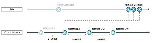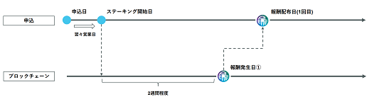 ステーキング開始日から、ブロックチェーン上での初回の報酬発生日まで2週間程度必要です。 初回の報酬発生日以降は、3~4日ごとに報酬発生日が到来します。